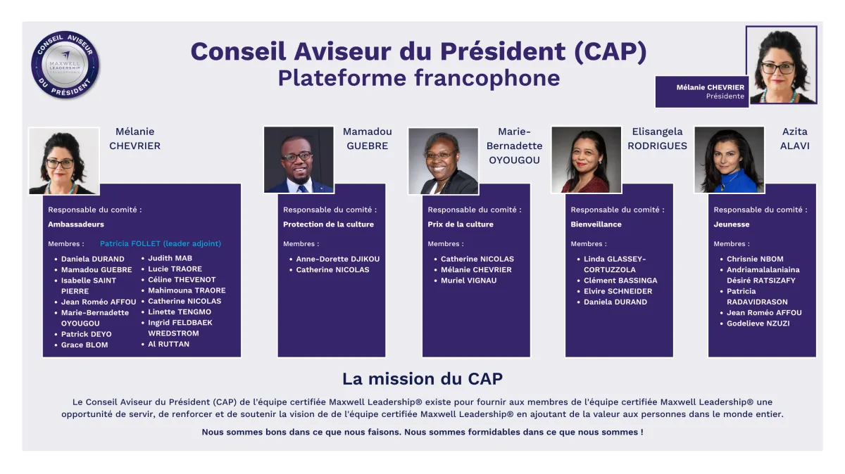 Le Conseil Aviseur du Président a été créé pour donner aux membres de notre équipe une voix dans la façon dont le programme et le contenu du programme sont administrés sur une plateforme globale. Le CAP permettra d’accélérer l’influence et l’impact de l’équipe Maxwell Leadership à travers la francophonie. Votre voix compte et le CAP donne l'occasion à tous nos membres de contribuer de diverses manières pour s'assurer que l'équipe Maxwell Leadership reste la meilleure organisation en matière de développement du leadership et de développement des compétences en matière de coaching, d'art oratoire, de formation et d'enseignement.